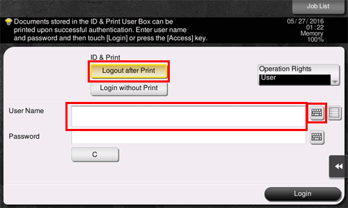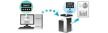 Since you need to be authenticated in this machine to print the data saved in the box, this function is suitable for safely printing highly confidential documents. When you are successfully authenticated, the print data of the login user is automatically printed. This enhances security as well as ensures smooth operation.
