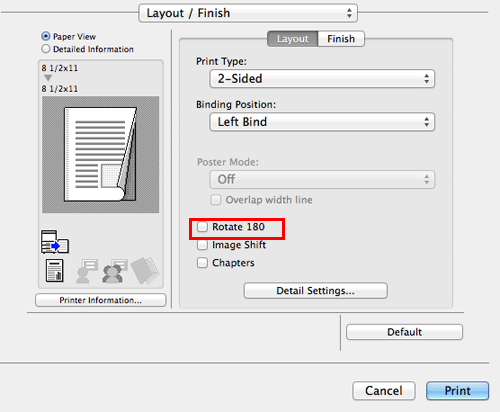 In [Layout / Finish], select the [Rotate 180] check box.