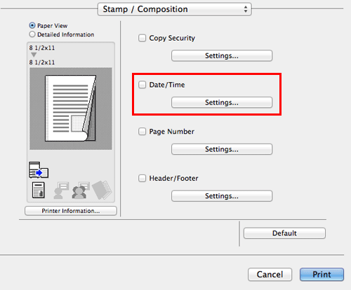 In [Stamp / Composition], select the [Header/Footer] check box, then click [Settings...].