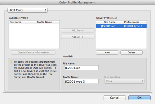 To use the new ICC profiles registered this machine, you need to add the ICC profiles to the printer driver in advance. For details, refer to Here.