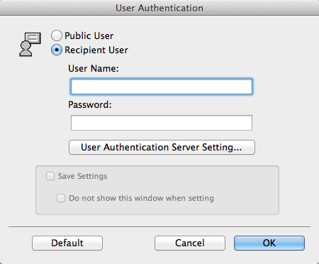 When user authentication is enabled, select [Recipient User], enter the user name and password, then click [OK].