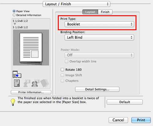 In [Print Type:] in [Layout / Finish], select [2-Sided]. [2-Sided] is specified by default.