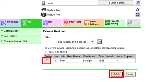 A job, which has been sent to this machine with [Proof Print] enabled, can be deleted remotely using Web Connection via the Web browser of the computer.