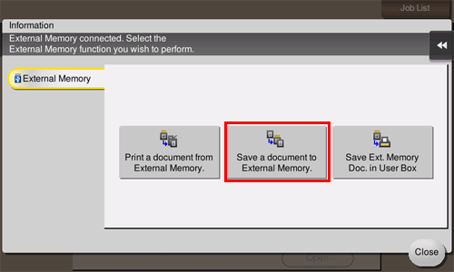 • You can also save files by selecting the User Box operation mode and by tapping [System] - [External Memory] - [Save].