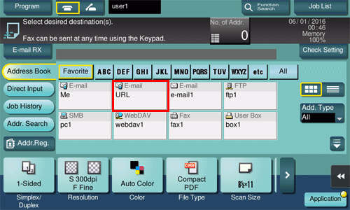 If you select the [URL] key displayed on the [Address Book] screen, you can send the URL to download the original data scanned on this machine, to your E-mail address by E-mail. When you log in to this machine that provides user authentication, the [URL] key appears on the [Address Book] screen. The [URL] key has the login user's E-mail address registered. The scanned original data is saved in a User Box on this machine without being attached to an E-mail during the pre-specified period, so data can be acquired regardless of the transmission capacity limit of the E-mail server.