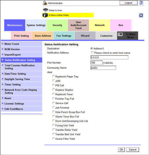 To notify of the machine status using SNMP TRAP function, select in the administrator mode [Maintenance] - [Status Notification Setting] - [IP Address] or [IPX Address] - [Edit], then configure the following settings.