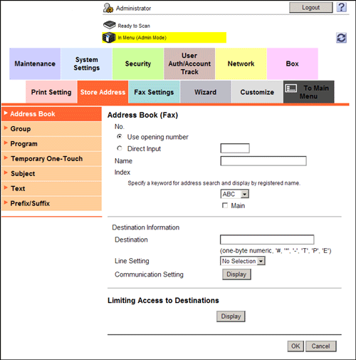 In the administrator mode, select [Store Address] - [Address Book] - [New Registration] - [Fax], then click [OK] to configure the following settings.