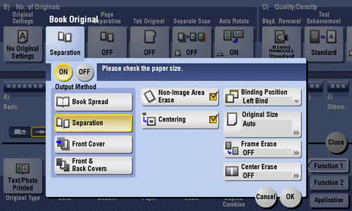 [Non-Image Area Erase] | If you select Book Original, this item is set automatically. When making copies with the ADF open and the original placed on the Original Glass, the machine detects the outline of the original and erases the area outside the original. Cancel the setting if necessary. |