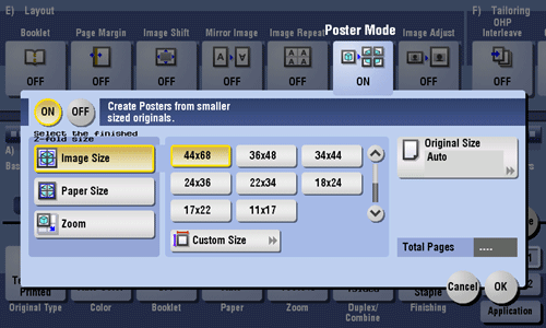 • [Paper Size]: Specify the finished size, which includes both the size after the image is enlarged and the overlap margin, in paper size. When you join the copied sheets at overlap margins, the finished size is smaller than the specified paper size.