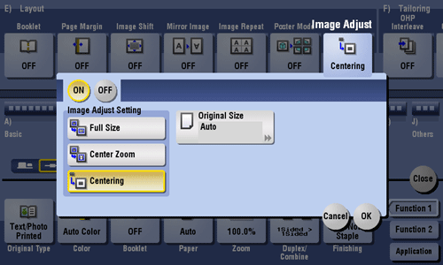 • [Centering]: The original image is copied at the center of the page without enlarging or reducing it. If the paper size is smaller than the image, part of the image may be lost.