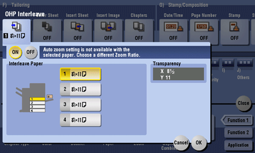 [Interleave Paper] | Select the paper tray for the paper to be inserted between transparencies. The paper size of the transparencies loaded on the Bypass Tray is displayed in [Transparency]. Be sure to use the same size for loaded transparencies and the paper to be inserted. |