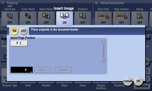 [Insert Page Position] | Specify a page number you want to insert a sheet into. The original is inserted after the page you have specified.