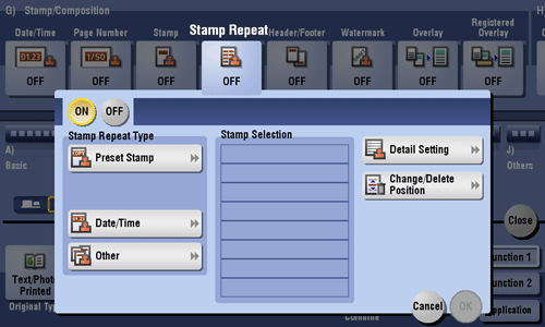 [ON]/[OFF] | Select [ON] to repeatedly print a stamp. |