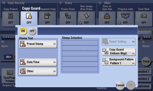 You can use the Copy Guard function when the optional Security Kit is installed and the Copy Guard function is enabled on this machine. For details on how to enable the Copy Guard function, refer to Here.