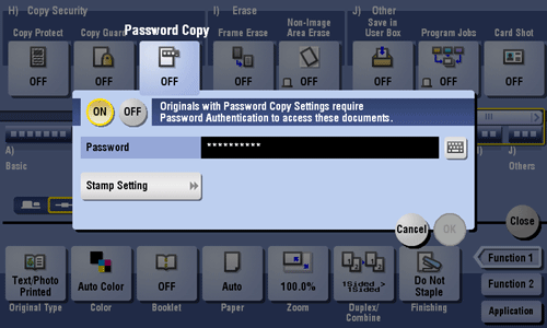 Password Copy is a copy protection function that prints concealed security watermarks such as "Private" or a date in the background to prevent unauthorized copying, and embeds a password for the password copy function on all printed sheets.