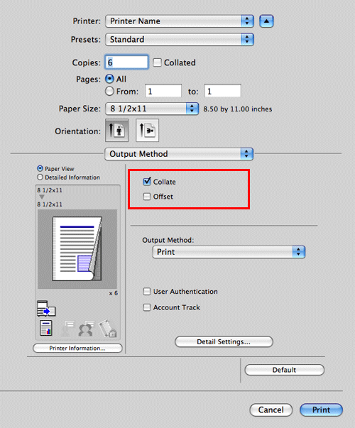 When the [Collate] check box in [Output Method] is selected, copies are output in a set-by-set manner, for example, "Pages 1, 2, 3, 4, and 5", "Pages 1, 2, 3, 4, and 5", and then "Pages 1, 2, 3, 4, and 5". When the [Offset] check box is selected, the sets are output in staggered layers.