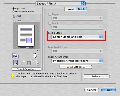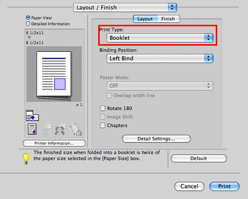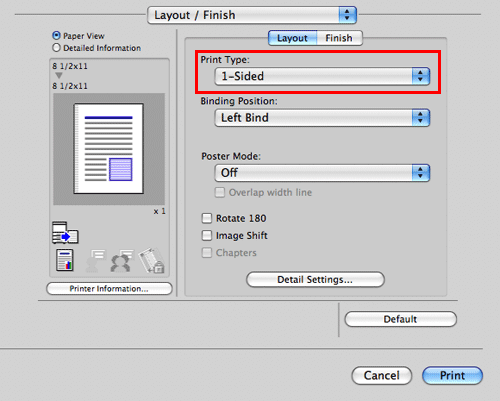 In [Print Type:] in [Layout / Finish], select [1-Sided].