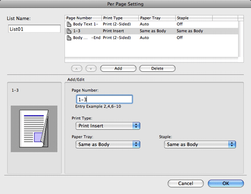 Create in advance a list that specifies the paper and print settings for each page. When printing on inserted paper, select the list you want to apply to printing.