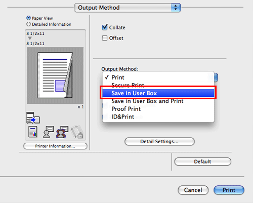 In [Output Method:] in the [Output Method] window, select [Save in User Box].