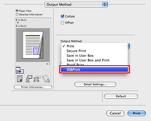 If [ID & Print] is set to [ON] in [ID & Print Settings], a print job is considered as an ID & Print job even if [Output Method] is set to [Print] for the printer driver (default: [OFF]). For details on [ID & Print Settings], refer to Here.