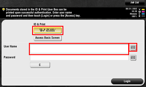 Since you need to enter the ID and password from the Touch Panel to print the data saved in the box, this function is particularly suitable for safely printing highly confidential documents.