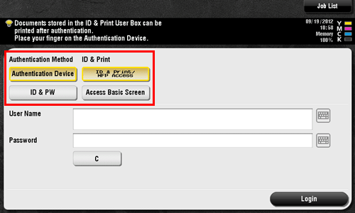 Check that [ID & Print/MFP Access] is selected in [ID & Print], and tap [Login].