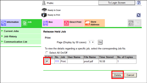 A job, which has been sent to this machine with [Proof Print] enabled, can be deleted remotely using Web Connection via the Web browser of the computer.