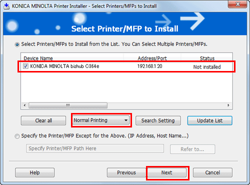 If the connection to this machine cannot be recognized, it is not displayed in the list. In such a case, select [Specify the Printer/MFP Except for the Above. (IP Address, Host Name...)], and manually specify the IP address and host name of this machine.