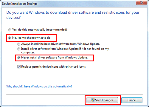 Select [No, let me choose what to do], select [Never install driver software from Windows Update.], then click [Save Changes].