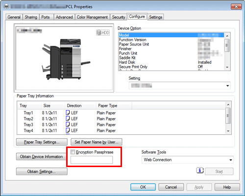 • If OpenAPI communication is SSL-encrypted and the device information can be automatically obtained from the printer driver, the encrypted passphrase can be obtained from this machine. For details on how to encrypt OpenAPI communication with SSL, refer to Here.