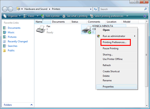 In Windows 7/8/8.1/Server 2008 R2/Server 2012/Server 2012 R2, right-click the icon of the installed printer, and from [Printing Preferences], click the displayed printer name.