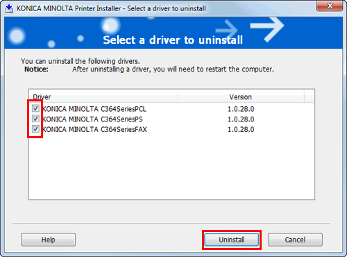 ] in the Start window, select [Control Panel] - [Programs], then click [Uninstall a program]. In the list, double-click [KONICA MINOLTA C554_C364Series(PS_PCL_FAX)] or [KONICA MINOLTA C554_C364Series(XPS)].