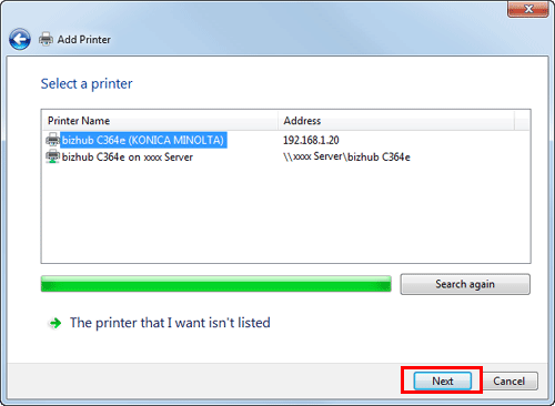 In the [Printer Name or IP Address:] box, enter the IP address for the machine, and then click [Next >].