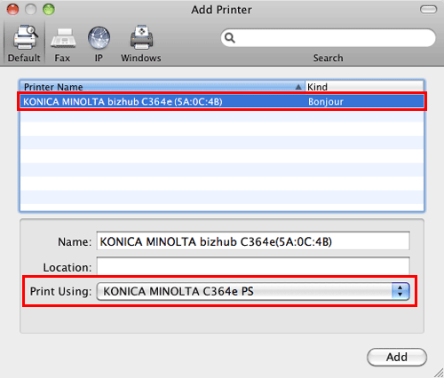 Add the printer automatically detected by Bonjour to the computer.