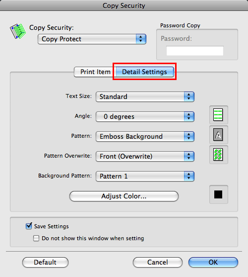[Pattern:] | Select whether the text pattern is embossed or outlined when the original is subjected to unauthorized copying. |