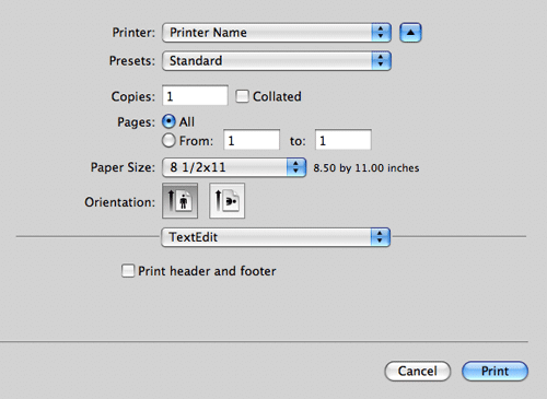 In Mac OS X 10.5/10.6/10.7/10.8/10.9, [Format for:] and [Orientation:] are also displayed, but the function is the same as that available from [Page Attributes].