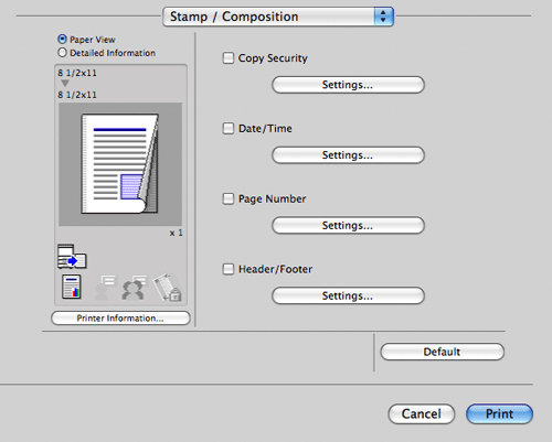 [Page Number] | Select this check box to add page numbers to the original. Clicking [Settings...] allows you to change the print position and the page from which the printing starts. For details, refer to Here. |