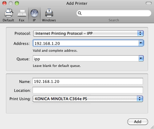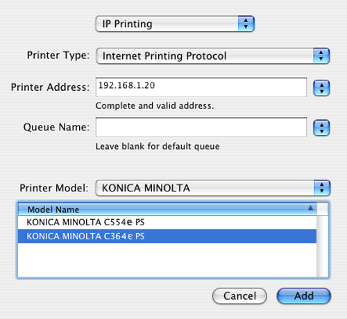 In [Address:], enter the IP address for the machine. In [Queue:], enter "ipp".