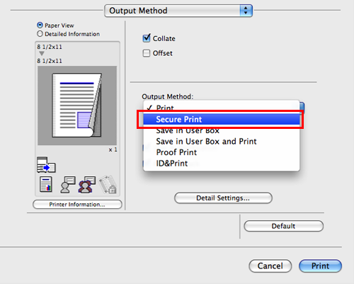 1. In [Output Method:] in the [Output Method] window, select [Secure Print].