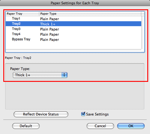 In [Paper Settings for Each Tray...], you can set a paper type for each tray. When you specify anything other than [Auto] in [Paper Tray:], the paper type information specified here is applied.