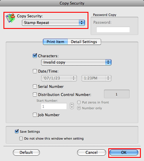 1. In [Stamp / Composition], select the [Copy Security] check box, then click [Settings...].