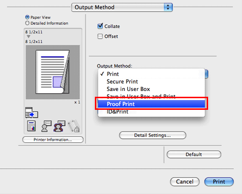 1. In [Output Method:] in the [Output Method] window, select [Proof Print].