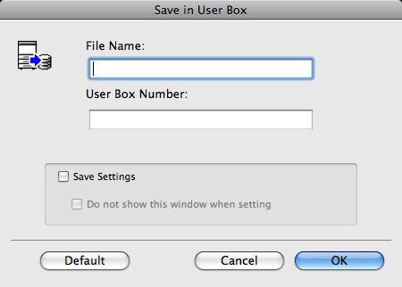 • When the [Save Settings] check box is selected, the settings are saved. When the [Do not show this window when setting] check box is selected, this dialog box is not displayed next time. If you always use the same file name and box number, selecting this check box eliminates the need for entering them each time.