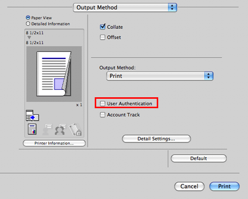 1. In the [Output Method] window, select the [User Authentication] check box (and the [Account Track] check box).
