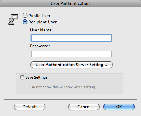 2. When user authentication is enabled, select [Recipient User], enter the user name and password, then click [OK].
