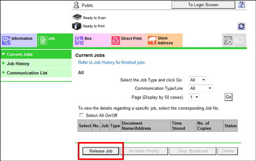 • A print job without authentication information is a print job that is sent without correctly configuring the User Authentication/Account Track setting using the printer driver even though the User Authentication/Account Track setting is configured on this machine.