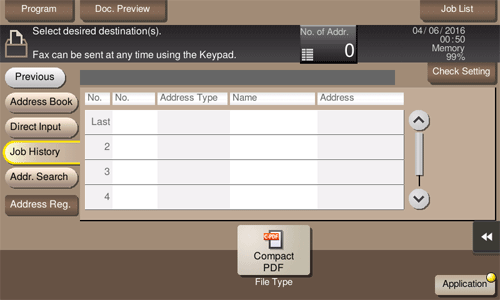 Tap [Job History], and you can select a destination from the scan or saved job history.