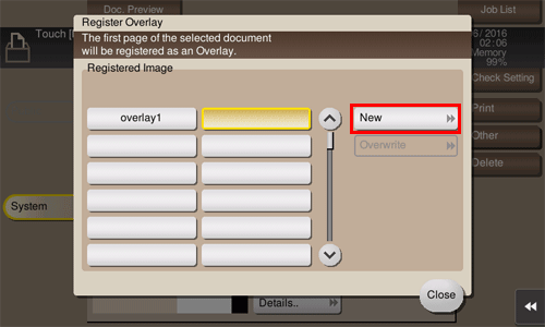 To register an overlay image by overwriting an existing one, select the registered key and tap [Overwrite].