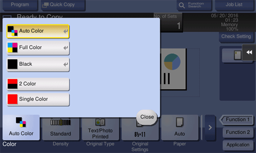[Auto Color] | The machine automatically selects [Full Color] or [Black] according to the color of the scanned original when copying. |