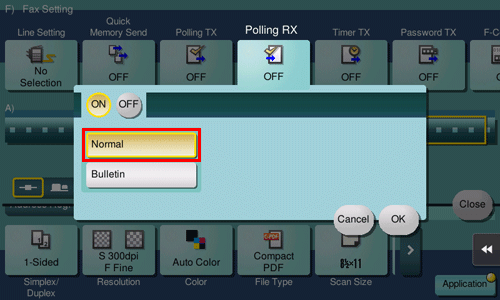 Tap [Application] - [Fax Setting] - [Polling RX], then tap [ON].